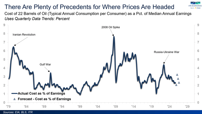 To see how this will impact consumers, we do a comparison of oil consumption costs to consumers’ ability to pay. The typical American consumer accounts for around 22 barrels of oil consumption per year. Using our oil price forecast and median annual earnings forecast, we can see the comparison of the cost of 22 barrels of oil relative to median income shows this price surge is (1) certainly notable, but also (2) significantly less severe than prior price surges, such as 1979 or 2008, that consumers have experienced in the past.