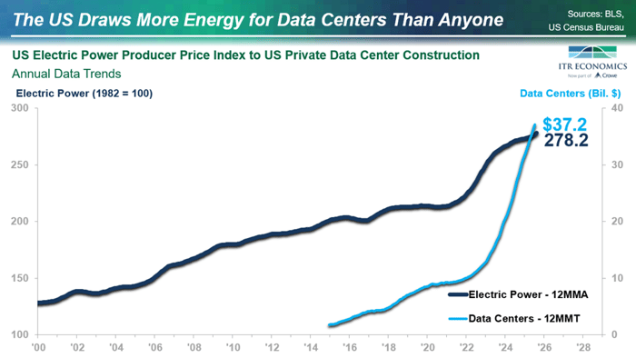It is important to note that electricity will not be the only rising costs businesses will likely face in the coming years. Concerns about electrical power costs will need to be balanced against concerns about human power costs, as ITR Economics projects that labor costs will increase by significantly more than is typical over the course of the next three years.